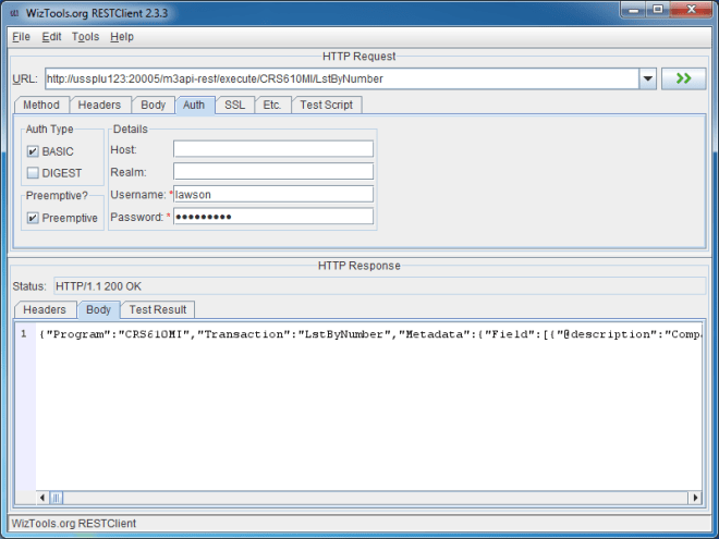 Paste the URL, set the M3 userid and password in the Authentication tab, optionally set the Header to get the response in JSON, and click Go!