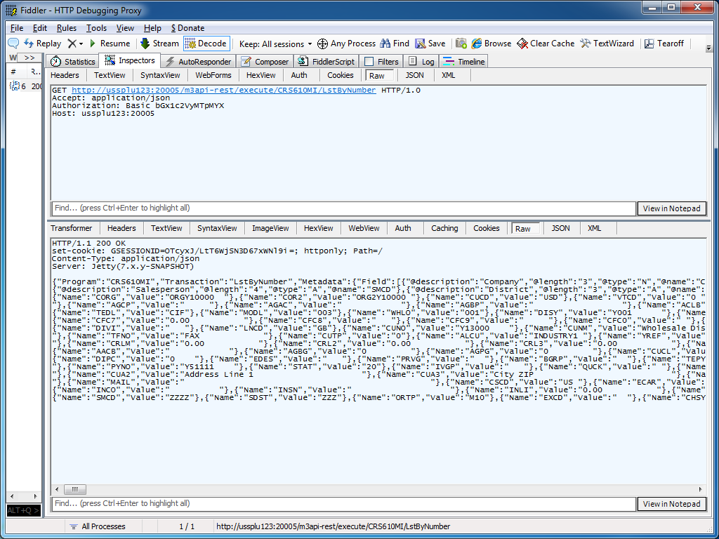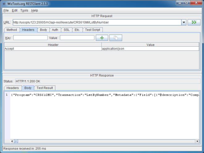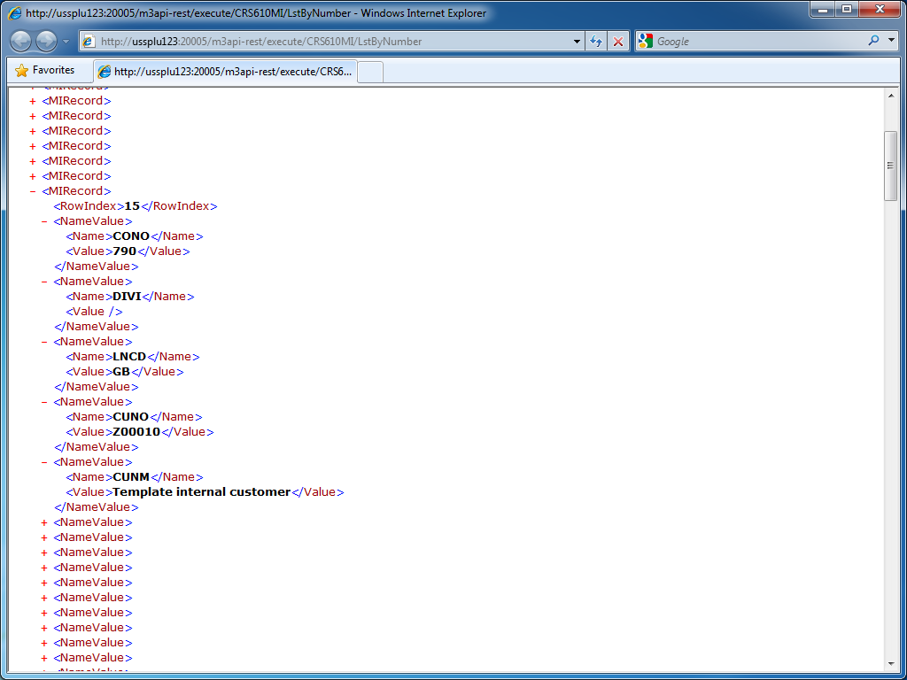 Let’s try to call the API CRS610MI.LstByNumber. The URL in my example would be: http://ussplu123:20005/m3api-rest/execute/CRS610MI/LstByNumber