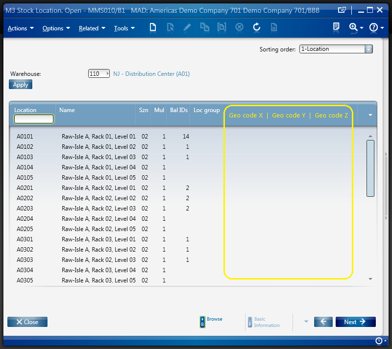 The desired result is the list Stock Location – MMS010/B1 with three new columns Geo code X, Y, and Z.