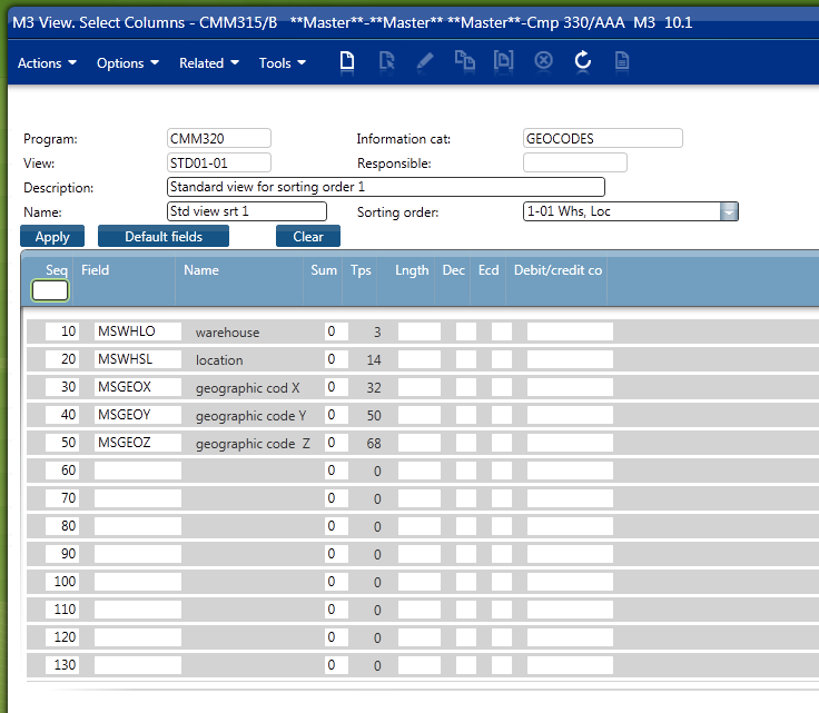 - Then, I create a new View in CMM315 where I include the desired new columns, MSGEOX, MSGEOY, and MSGEOZ in this example: