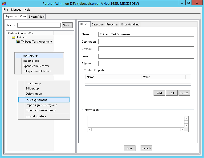 9. In the Agreement View, right-click and select Insert group, enter a name for the group, then right-click the group and select Insert agreement, enter a name for the agreement, then in the Basic tab enter a Name: