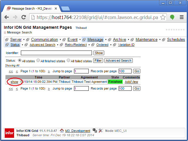 4. Back in the Infor Grid Management Pages, go to the Message tab and click show on your message: