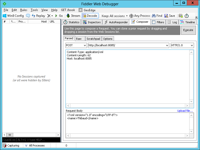 POST http://localhost:8085/ HTTP/1.0 Content-Type: application/xml Content-Length: 62 Host: localhost:8085 <?xml version="1.0" encoding="UTF-8"?> <name>Thibaud</name>