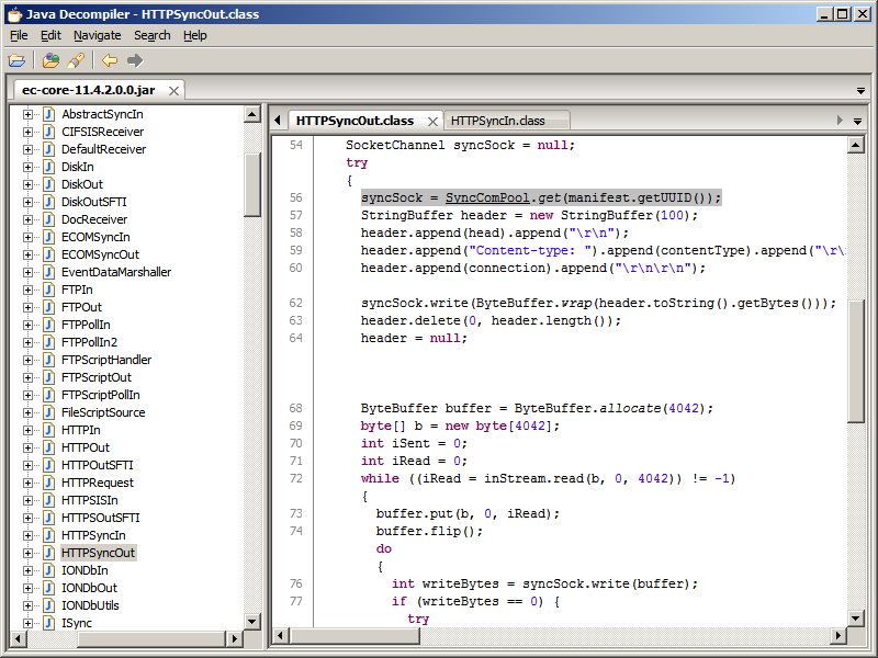 And here is an excerpt of the decompiled Java classes HTTPSyncIn and HTTPSyncOut of package com.intentia.ec.communication: