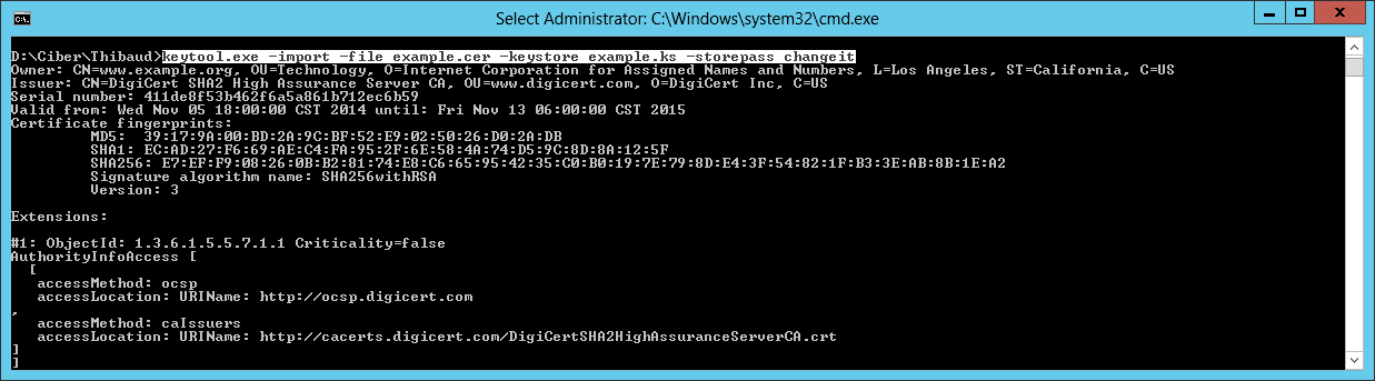 6. Import the certificate to a keystore, e.g. example.ks: