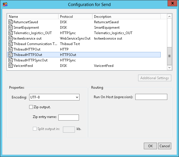 4. Select protocol HTTPSOut and enter the information host, port number and path to the destination server, as well as the keystore where you saved the certificate and the keystore password, and optionally set user and password for HTTP Basic authentication to the destination server (provided you corrected the authentication bug):