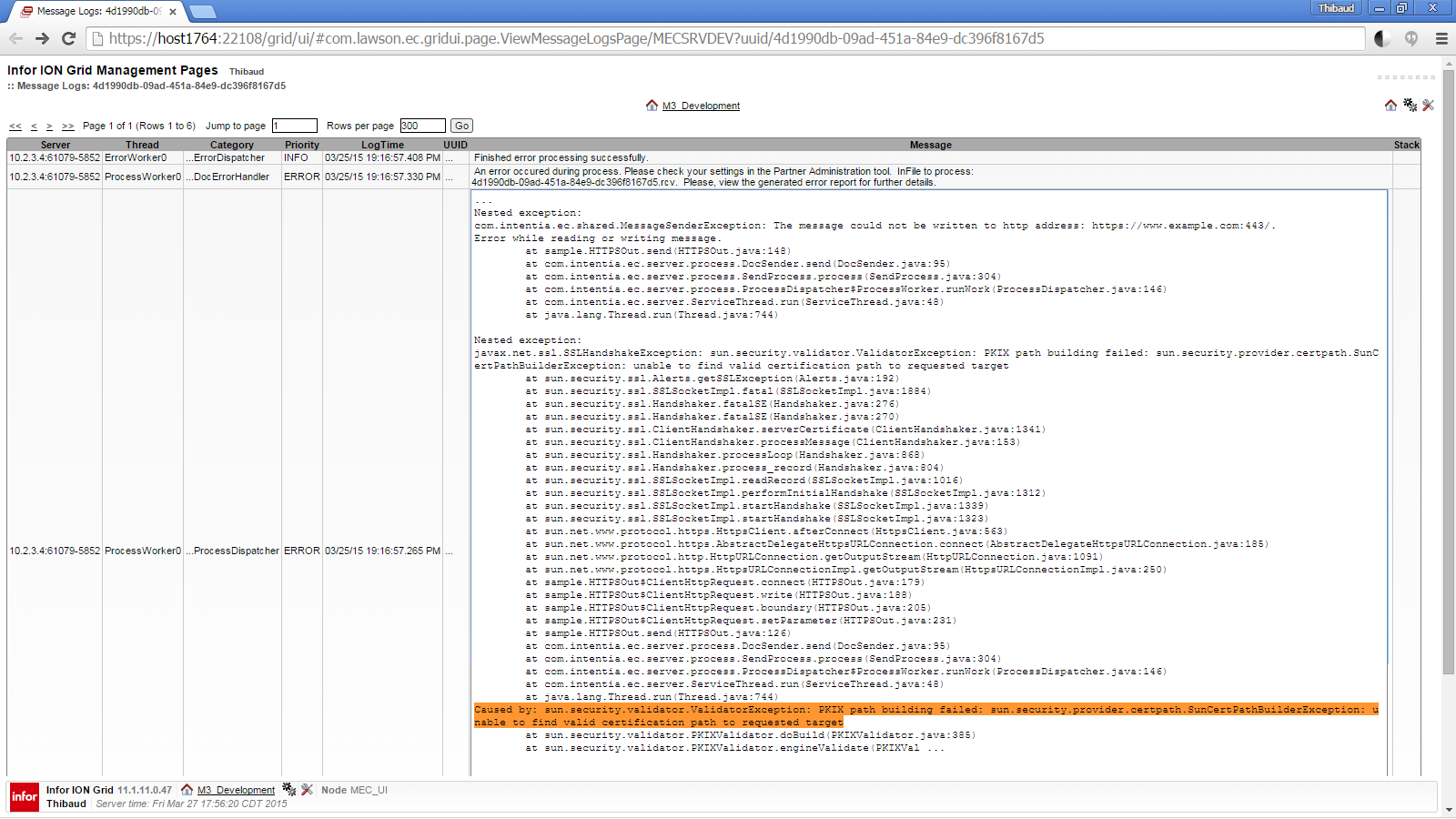 That means the server certificate validation failed, either because we put the incorrect server certificate in the keystore that we defined in PartnerAdmin, either because a man-in-the-middle server presented a different certificate.