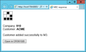 <!DOCTYPE html> <html> <head> <title>MEC response</title> <link rel="stylesheet" type="text/css" href="http://host1623:22107/mne/Test.css" /> </head> <body> <img src="http://host1623:22107/mne/Test.png" alt="Test" /> Company: <span id="CONO">910</span> Customer: <span id="CUNO">ACME</span> Customer added successfully to M3. <input id="btn" type="button" value="Open in CRS610/B" /> <script type="text/javascript" src="http://host1623:22107/mne/Test.js"></script> </body> </html>