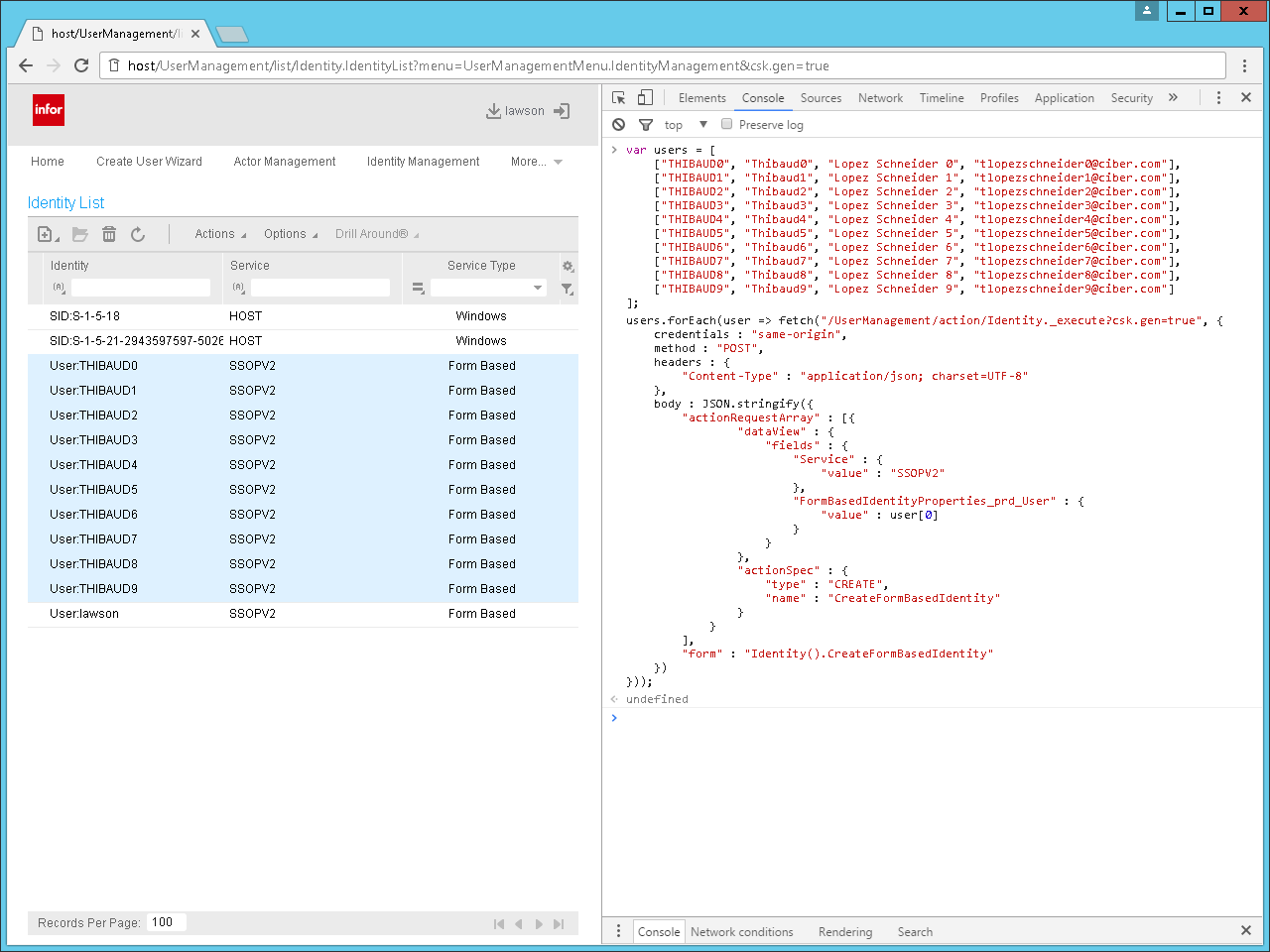 Here below is the result. It supposes you already have an array of users which you can generate with SQL or M3 API (from MNS150 and CRS111).