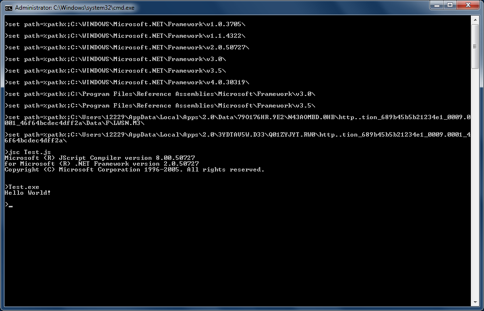 Here is a screenshot that shows Hello World! from a Smart Office Script in JScript.NET compiled at the command line (note the extra print statement at the bottom):