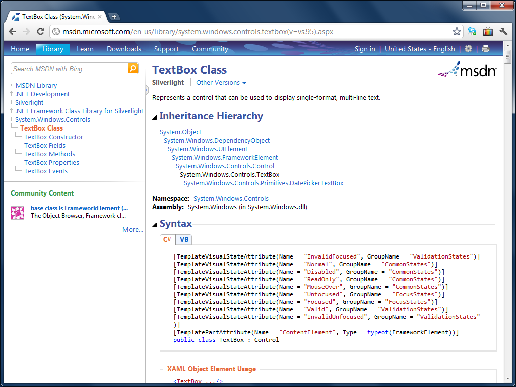 I refer extensively to Microsoft’s MSDN .NET Framework Class Library. When I need the API reference for a control (for example a TextBox) I just Google the following: