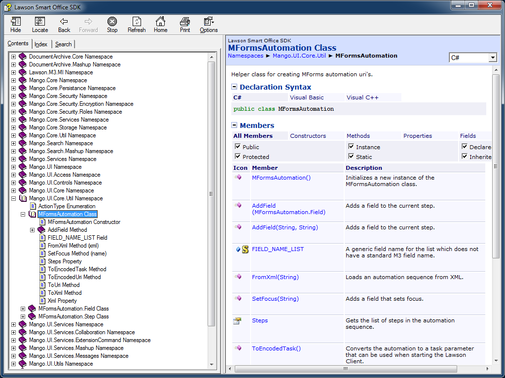 The Smart Office SDK is the premier source of information. We can see the official public interface, descriptive comments, and we can search for classes and members. Right now it’s only available to Infor employees and select partners.