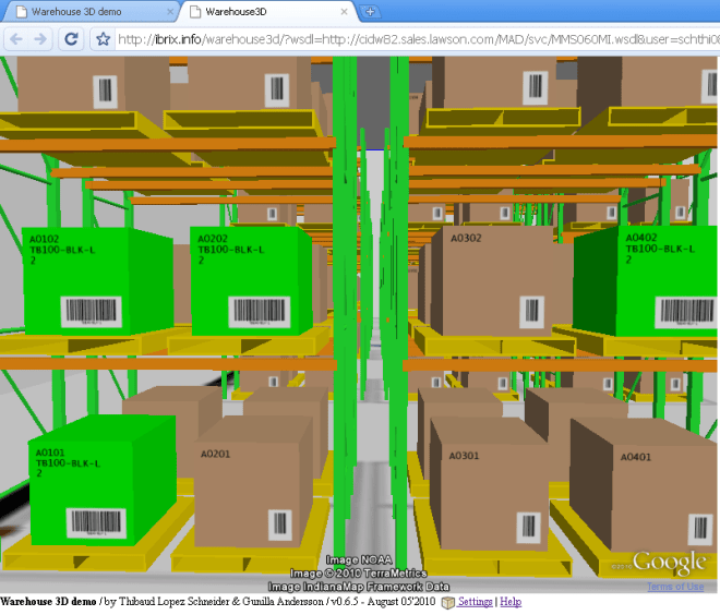 You can try the demo for yourself with your own M3 environment. For that, you will need several things. You will need to install the Google Earth plugin in your browser. You will also need to deploy the Lawson Web Service for MMS060MI provided here; note that your LWS server must be in a DMZ so that the http://www.ibrix.info web server can make the SOAP call over HTTP. Also, you will need to follow the Settings wizard to setup your own M3 environment, user, password, CONO, WHLO, etc. The result is a long URL that is specific to your settings.