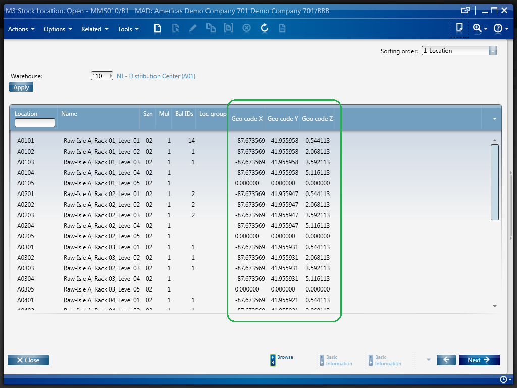 The result is the list of Stock Locations in MMS010/B1 displaying all the Geo Codes XYZ: