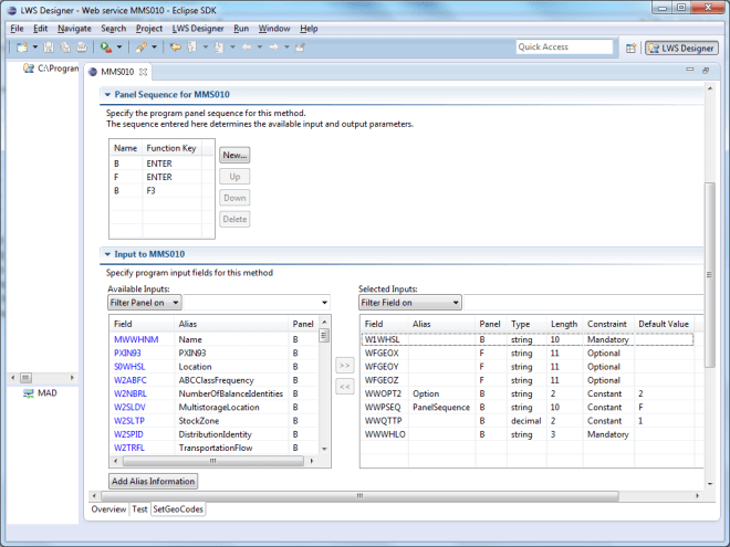 Then, I used this Lawson Web Service of type Display Program to set the values for the fields Geo Code X (GEOX), Geo Code Y (GEOY), and Geo Code Z (GEOZ) in MMS010/F for a specified Warehouse (WHLO) and Stock Location (WHSL):