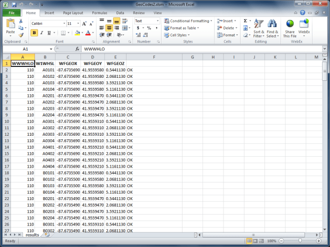 The result is this CSV file of the floor plan’s geocodes and each Stock Location’s geocodes: