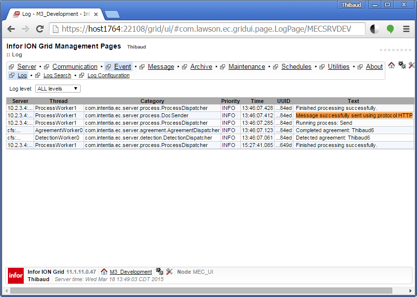 - For easy cross-reference to the MEC Management log files, output the manifest UUID to the XML output using the Java method com.intentia.ec.mapper.Mapping.getManifestInfo(“UUID”), and add a link to it in the HTML with the href to https://host1764:22108/grid/ui/#com.lawson.ec.gridui.page.MessageDetailPage/MECSRVDEV?uuid/xxxxxxxx-xxxx-xxxx-xxxx-xxxxxxxxxxxx
