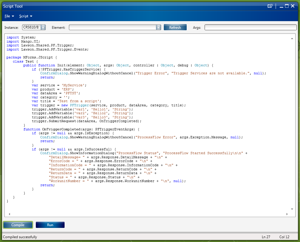 var service = 'MyService'; var product = 'ERP'; var dataArea = 'PFTST'; var category = ''; var title = 'Test from a script'; var trigger = new PFTrigger(service, product, dataArea, category, title); trigger.AddVariable('var1', 'Hello1', 'String'); trigger.AddVariable('var2', 'Hello2', 'String'); trigger.AddVariable('var3', 'Hello3', 'String');