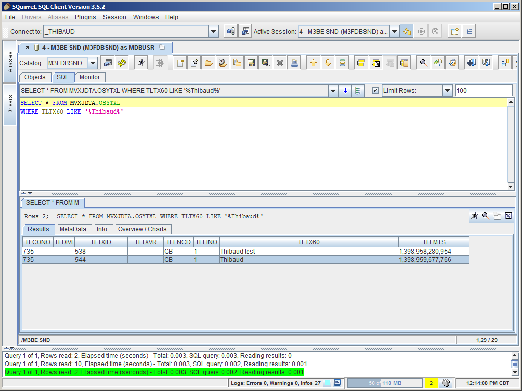 I never rememeber which M3 Program stores text in which pair of tables, for example it took me a while to remember that Customer text is stored in OSTYXL. There’s probably a short way to remember: perhaps somewhere in the M3 Companion, perhaps reading the cryptic M3 Java source code. I usually go to M3 MetaData Publisher (MDP), I search for tables with the word “text”, and then I go fishing for my text with SQL, searching the contents of the tables one by one. Yeah I know…there’s got to be a better way.