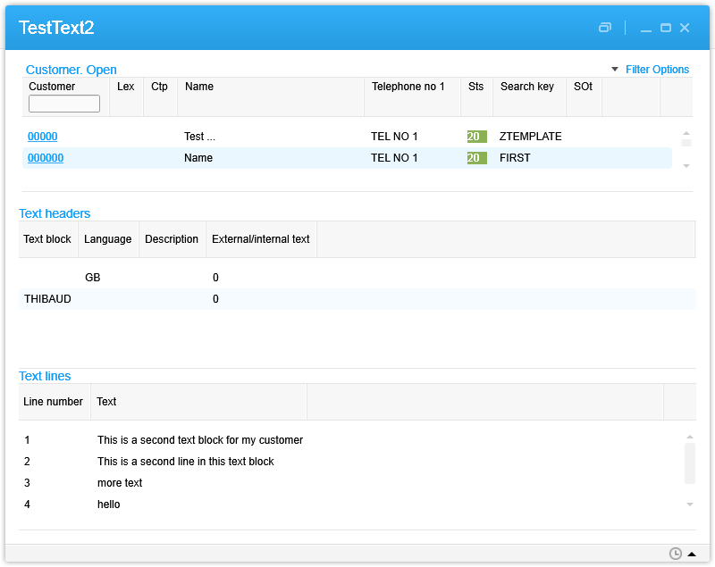 Here’s a screenshot of the result, with the list of customers at the top, the list of text headers for that customer in the middle, and the text lines for that text header at the bottom: