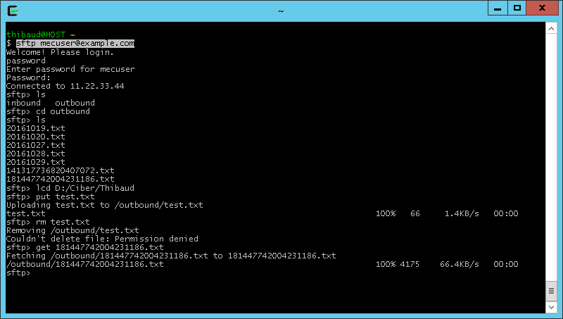 Then, do an SSH test (in my example I use the OpenSSH client of Cygwin). As usual with SSH TOFU, verify the fingerprint on a side channel (e.g. via secure email, or via phone call to the administrator of the SFTP server assuming we already know their voice):