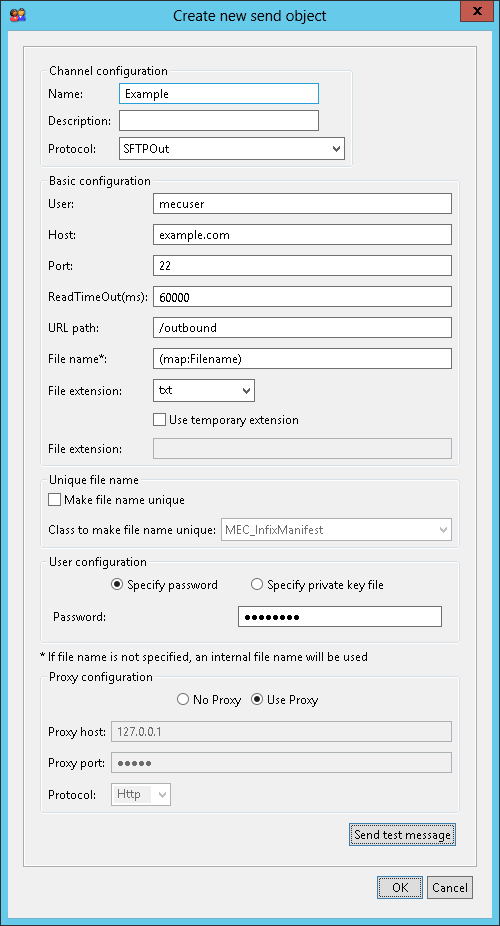 The button Send test message will send a file of our choice to that host/path: