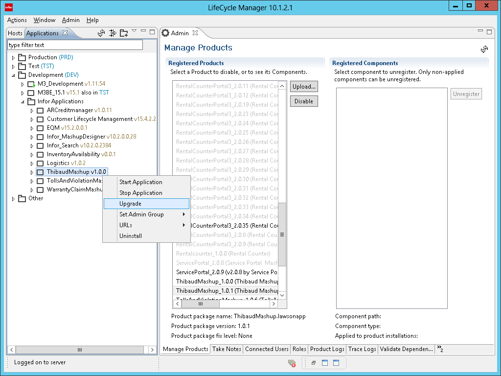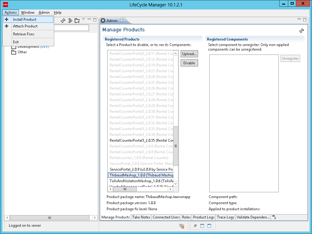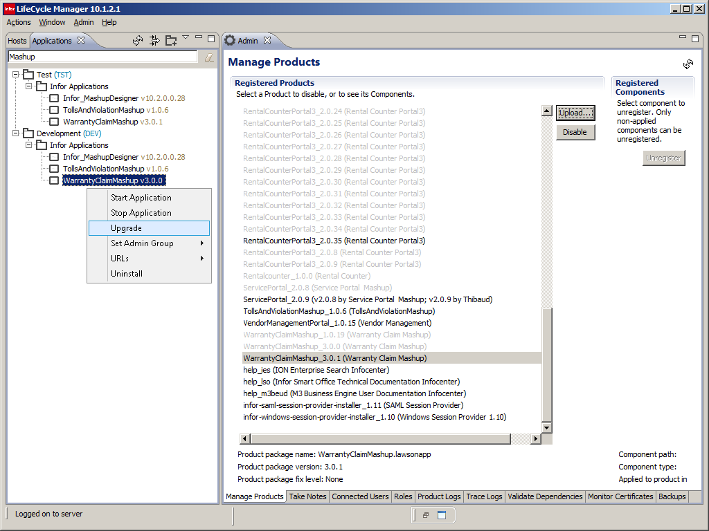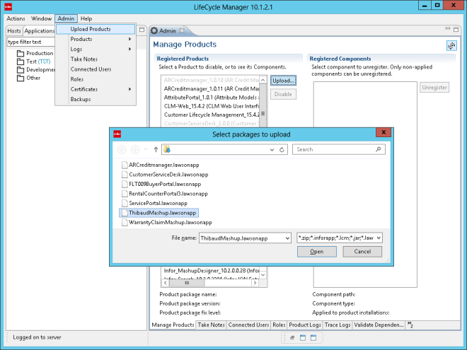 Then, we upload the .lawsonapp file to Infor LifeCycle Manager (LCM) > Admin > Upload Products > Upload (I switched Mashups, so the screenshots don’t match):