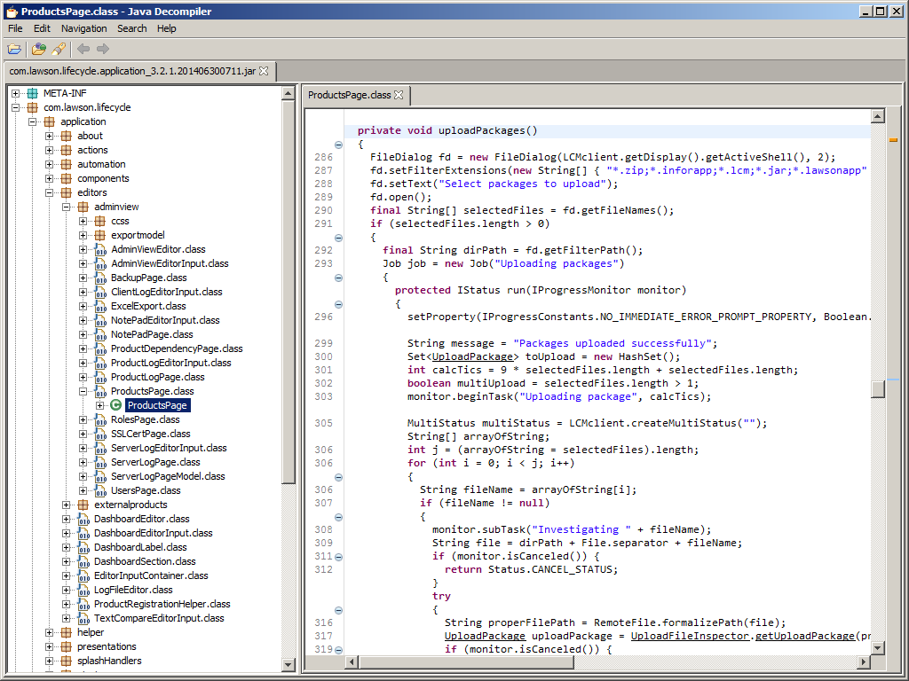 A quick search of the upload popup with the command findstr /c:"Select packages to upload" /s *.class in the LCM Client folder gives us the class D:\Infor\LifeCycleManagerClient\LCM-Client\plugins\com.lawson.lifecycle.application_3.2.1.201406300711\com\lawson\lifecycle\application\editors\adminview\ProductsPage.class with method uploadPackages() which calls the interface com.lawson.lifecycle.application.upload.UploadPackage.upload(monitor):