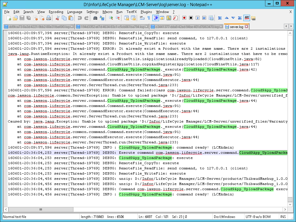 And a quick search in the LCM Client and Server logs gives us com.lawson.lifecycle.server.command.Cloud9App_UploadPackage: