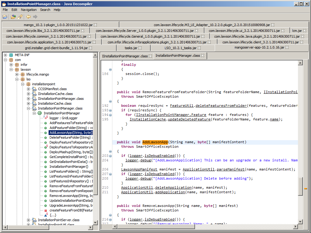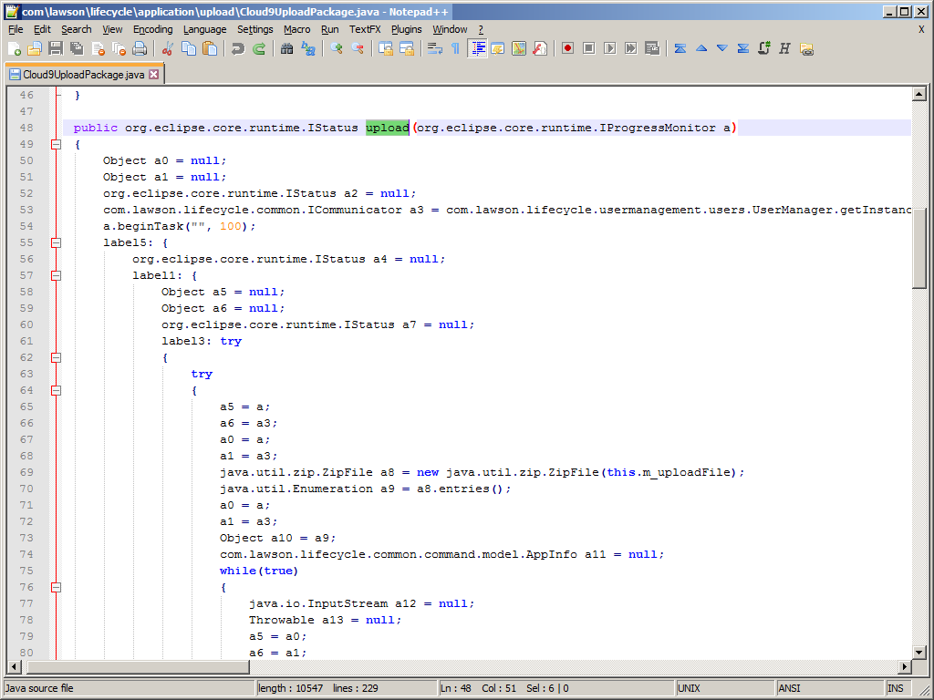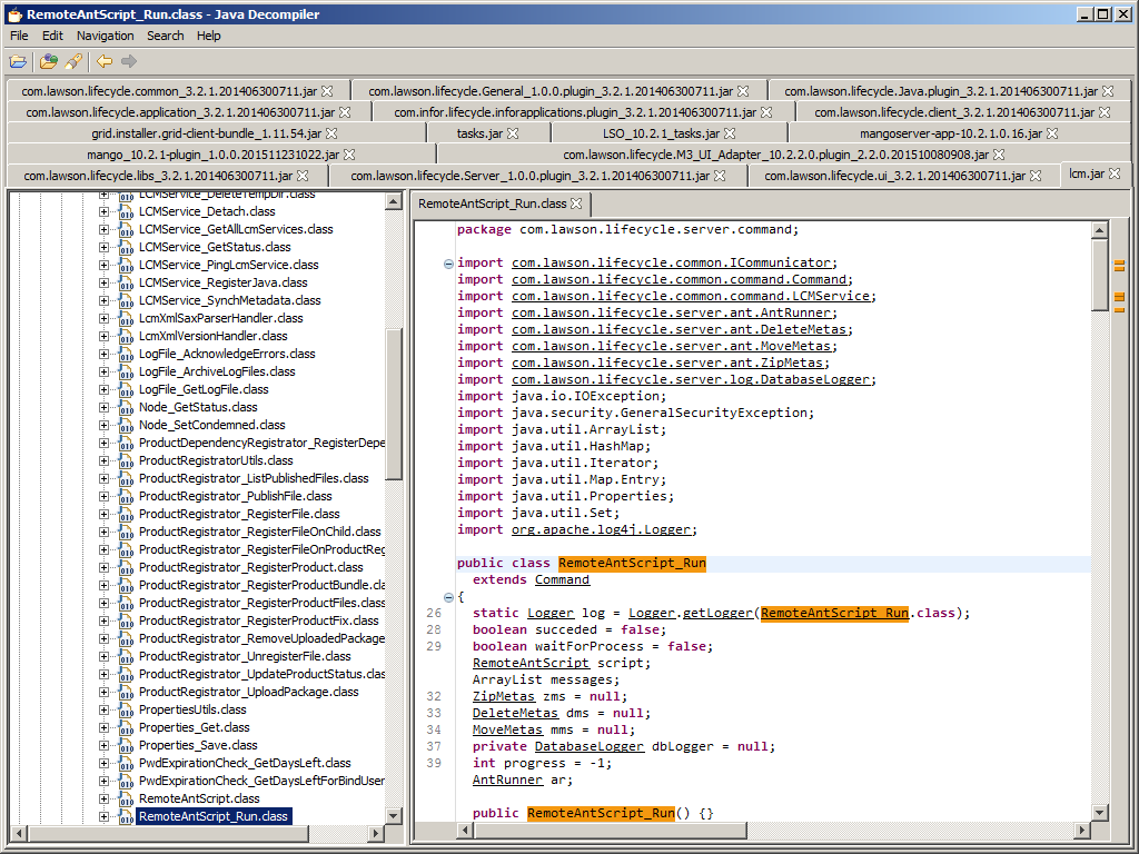 A quick search of the success message “Package successfully uploaded to LifeCycle Manager Server” gives us classes Cloud9UploadPackage.class which implements the interface and JavaInstallerUploadPackage.class in folder D:\Infor\LifeCycle Manager\LCM-Client\plugins\com.lawson.lifecycle.application_3.2.1.201406300711\com\lawson\lifecycle\application\upload\