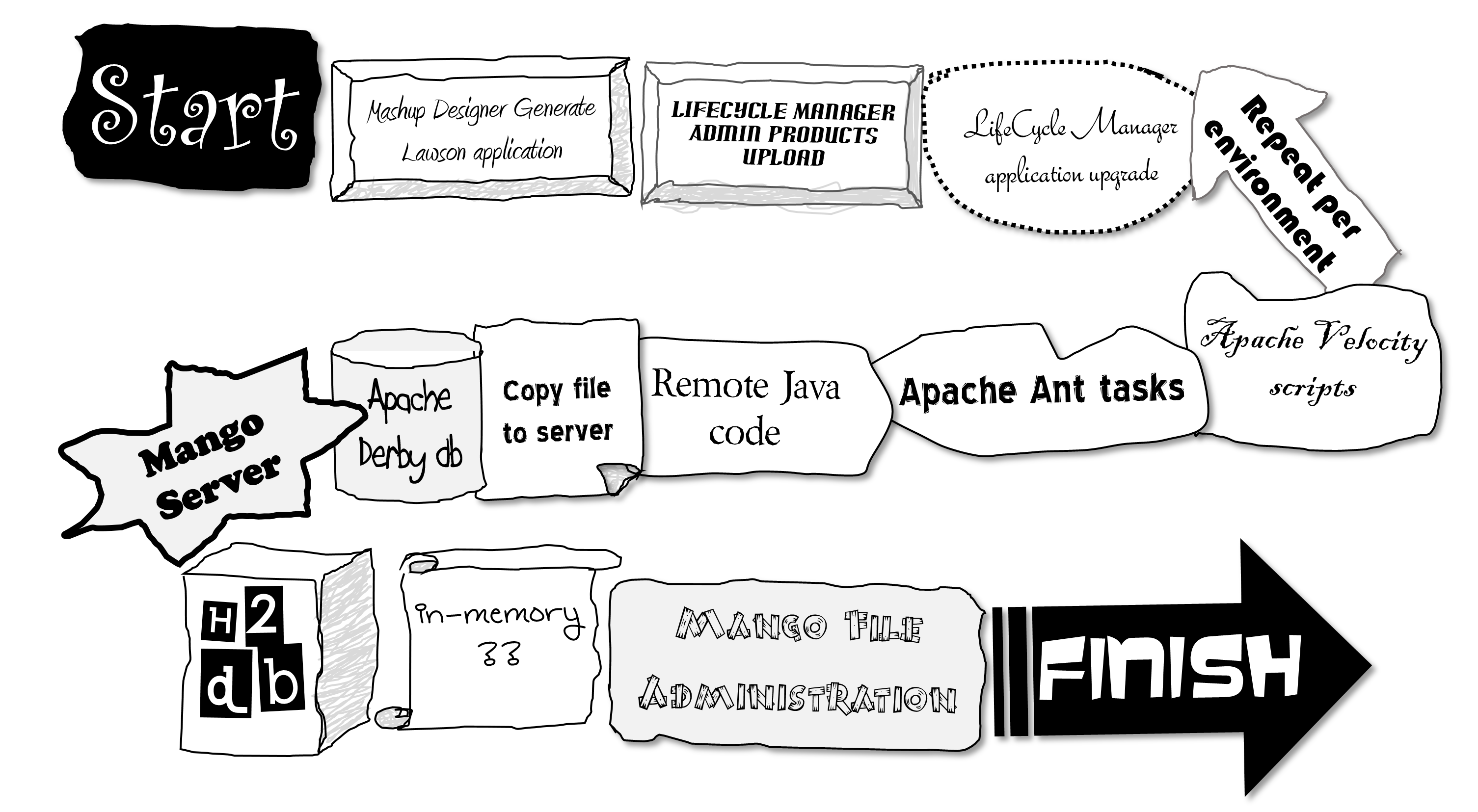 Deploying a Mashup globally involves Smart Office client/server, Mashup Designer, metadata and lots more metadata, LiceCycle Manager client/server, remote file copy, Apache Velocity templates that compile into Apache Ant scripts that execute remote code to add records to the Apache Derby database of LifeCycle Manager, then MangoServer gets duplicates of the Mashups from the Grid H2 database via SOAP web services, and finally Smart Office client stores local copies in the user’s computer.