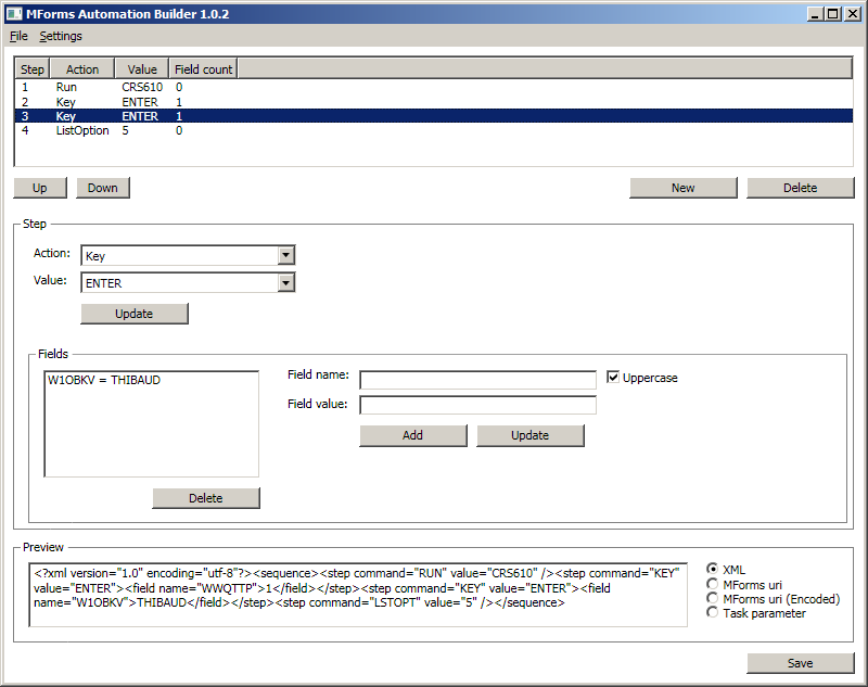 Note 1: I originally had the XPath expression searching too widely as //@*[starts-with(., ‘mforms://’)] but that unnecessarily caught MForms Automation URIs like mforms://_automation?data= and URIs that start M3 programs like mforms://CRS610 . Then I made the XPath expression too precise as //@*[starts-with(., ‘mforms://bookmark/?’)] but that failed to catch several valid URIs: those that start with a white space, those that have backslashes such as mforms:\\ , those that are mixed case such as MFORMS:// , and those that do not have the slash in the query such as mforms://bookmark? , all of which are valid. I could have used the XPath function normalize-space() for trimming, but then XPath 1.0 does not have the lower-case() function, only XPath 2.0 does. So I eventually decided to change the XPath expression to look for attributes Uri and LinkUri, and search for scheme mforms and host bookmark in script once the URI is parsed.
