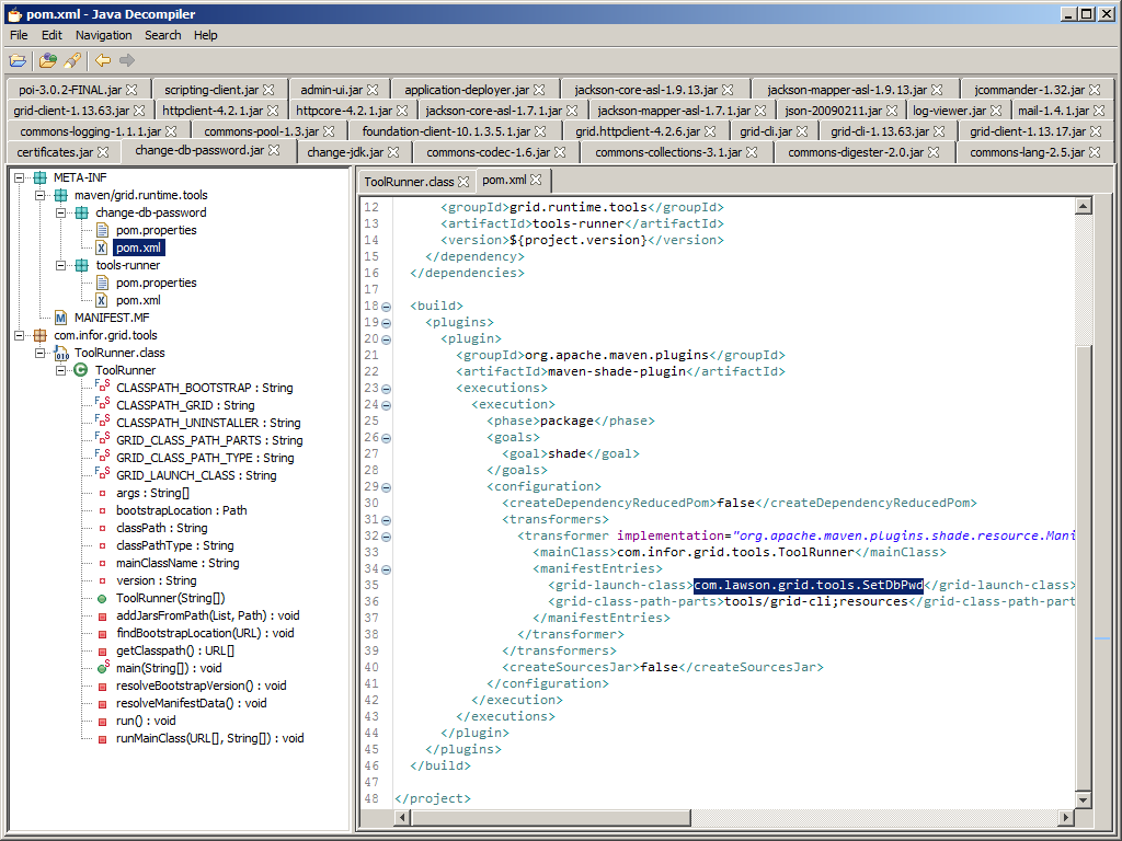Each tool references a grid-launch-class in the Maven POM, e.g. change-db-password: